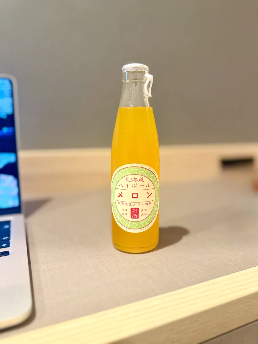 「北海道ハイボール」というシリーズがあるのは知っていましたが、メロンフレーバーがあるとは知りませんでした。アルコール度数や味を吟味する前に、このデザインとフレーバーが、旅のハイテンションな気分にマッチすると直感したのです。冷えた缶の結露が指先に伝わり、これから始まる至福の瞬間に期待が高まります。