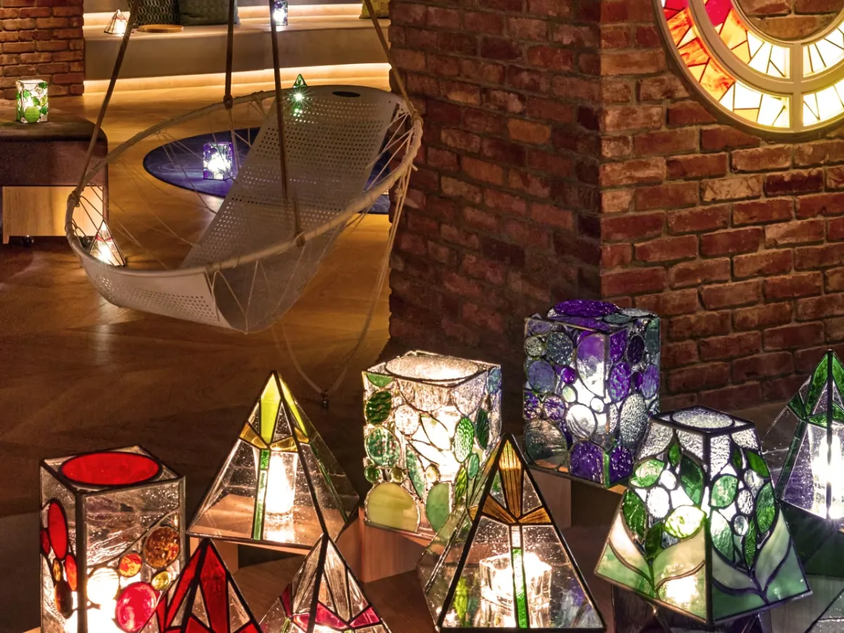 2. 空間デザイン: 函館山夜景の色をモチーフにしたステンドグラスの光が、心を安らげるムードを演出。