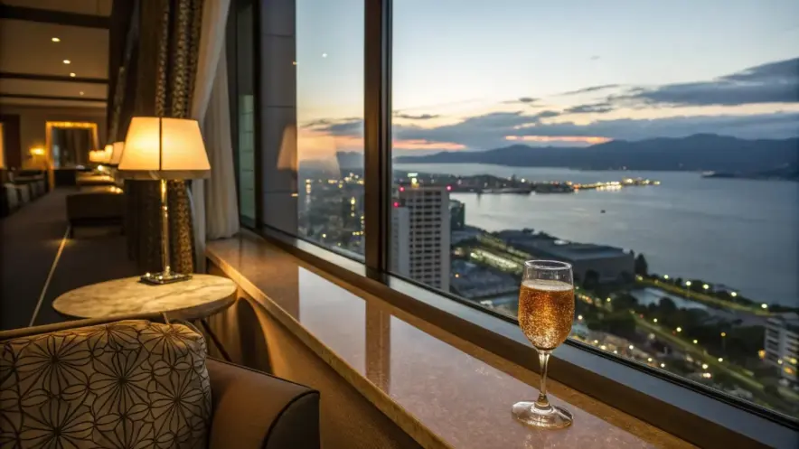 1. 時間帯と場所: 函館の夜、温泉上がり、そして旅の拠点であるホテルのラウンジという、究極のリラックスタイム。