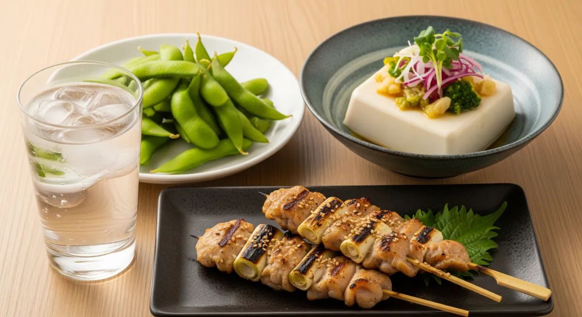 高タンパク・低糖質なもの(枝豆、豆腐、刺身など)を選ぶ。