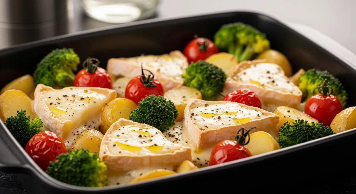 耐熱皿に、カットしたピエ・ダングロワと、ジャガイモやブロッコリー、ミニトマトなどの温野菜を入れる。